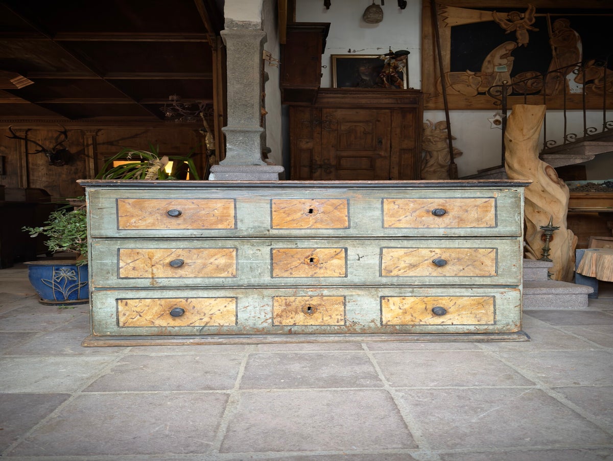 Direttamente dall’Alto Tirolo, questa splendida cassettiera tirolese realizzata in abete massello si distingue per le sue pitture centrali decorative che richiamano un elegante motivo marmorizzato. Un mobile dal fascino tradizionale e senza tempo, ideale per ambienti rustici, chalet o case in stile alpino.