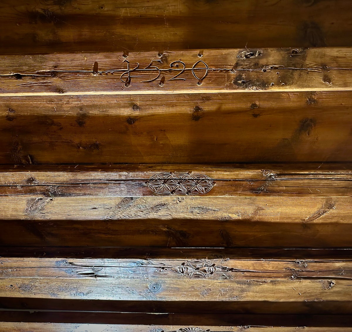Soffitto gotico, realizzato con travi e tavole in legno massello di notevole spessore. Questo soffitto è impreziosito da elaborati decori e vari simboli religiosi dell'epoca, che raccontano la storia e l'arte di un periodo affascinante.